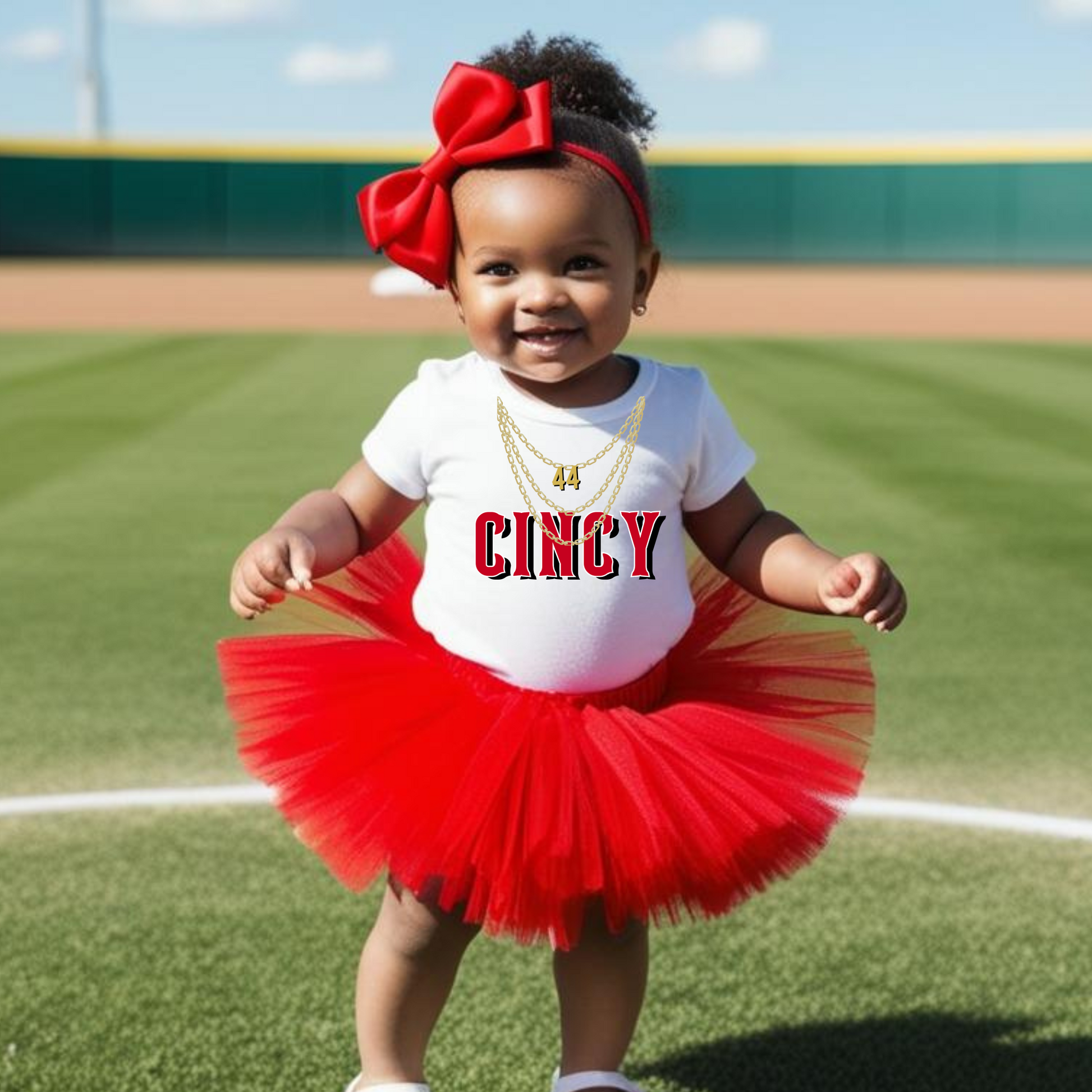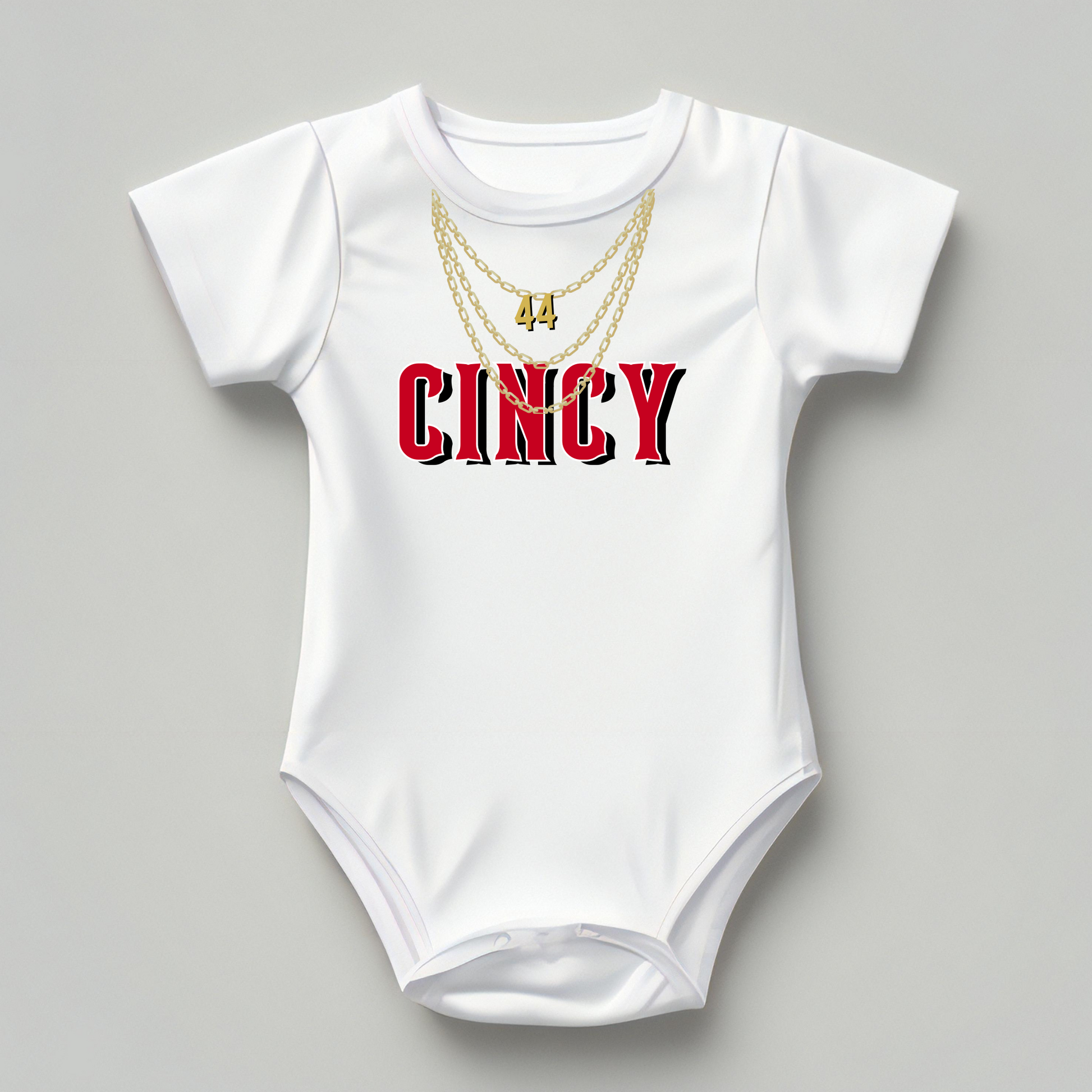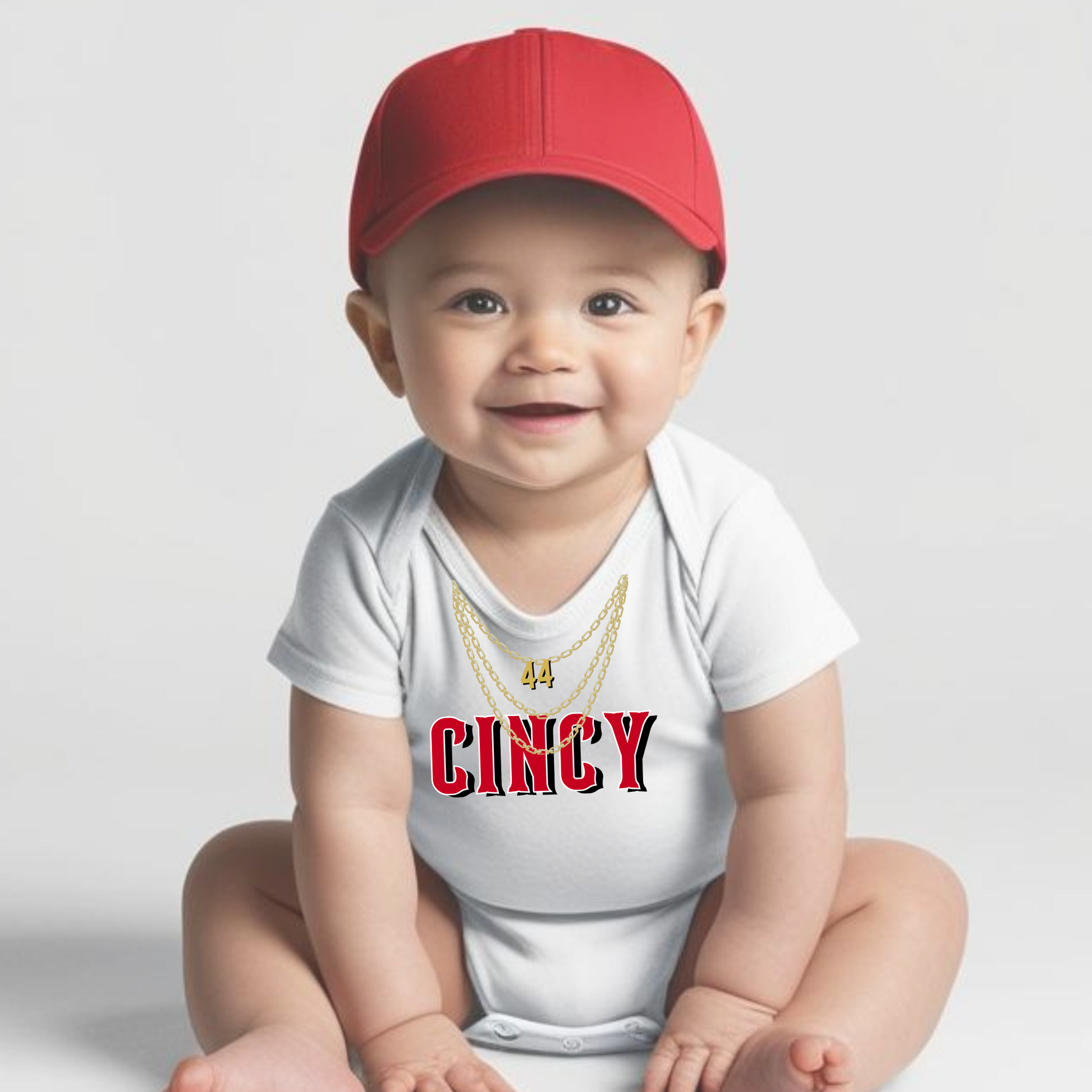 Bring the swagger of Cincinnati’s electrifying star to your little slugger’s wardrobe! The Cincy Drip 44 shirt is a must-have for young fans who love speed, style, and serious baseball energy. Featuring a bold imprint of a gold chain with the iconic #44, draped over the word "Cincy," this tee is a nod to Elly De La Cruz’s signature look on and off the field.