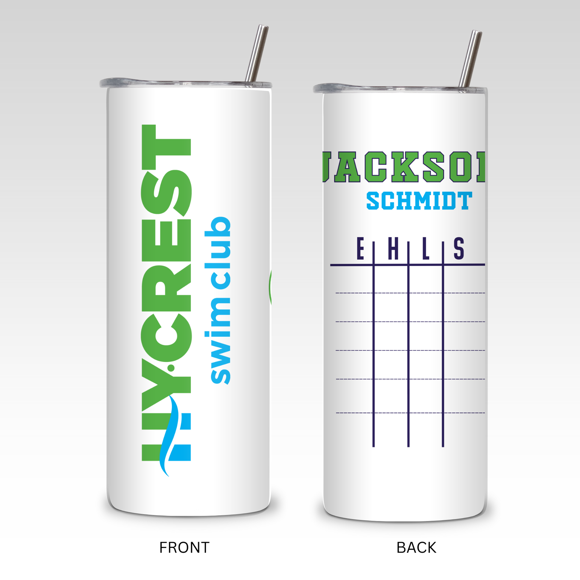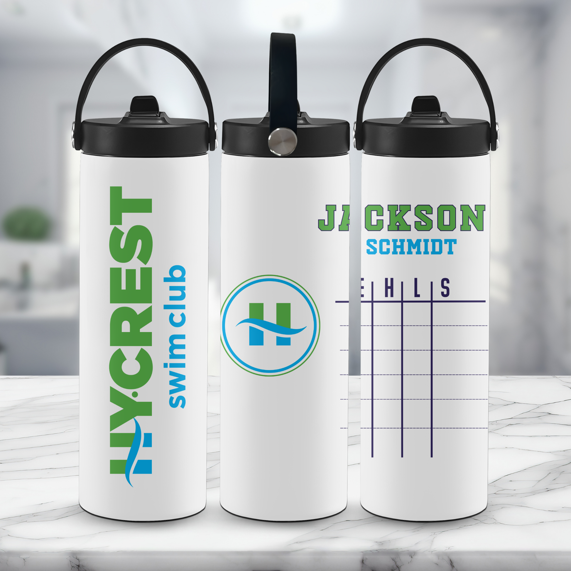 Meet day just got a whole lot easier. This Hy-Crest water bottle is made with swimmers (and their super-organized parents) in mind. It features the Hy-Crest Swim Club logo, your swimmer’s name, and a reusable Swim Meet Chart where you can jot down event numbers, heats, lanes, and strokes using a permanent marker. No more chasing down crumpled heat sheets—just spray, wipe, and reuse. It’s the perfect mix of team spirit and practical magic