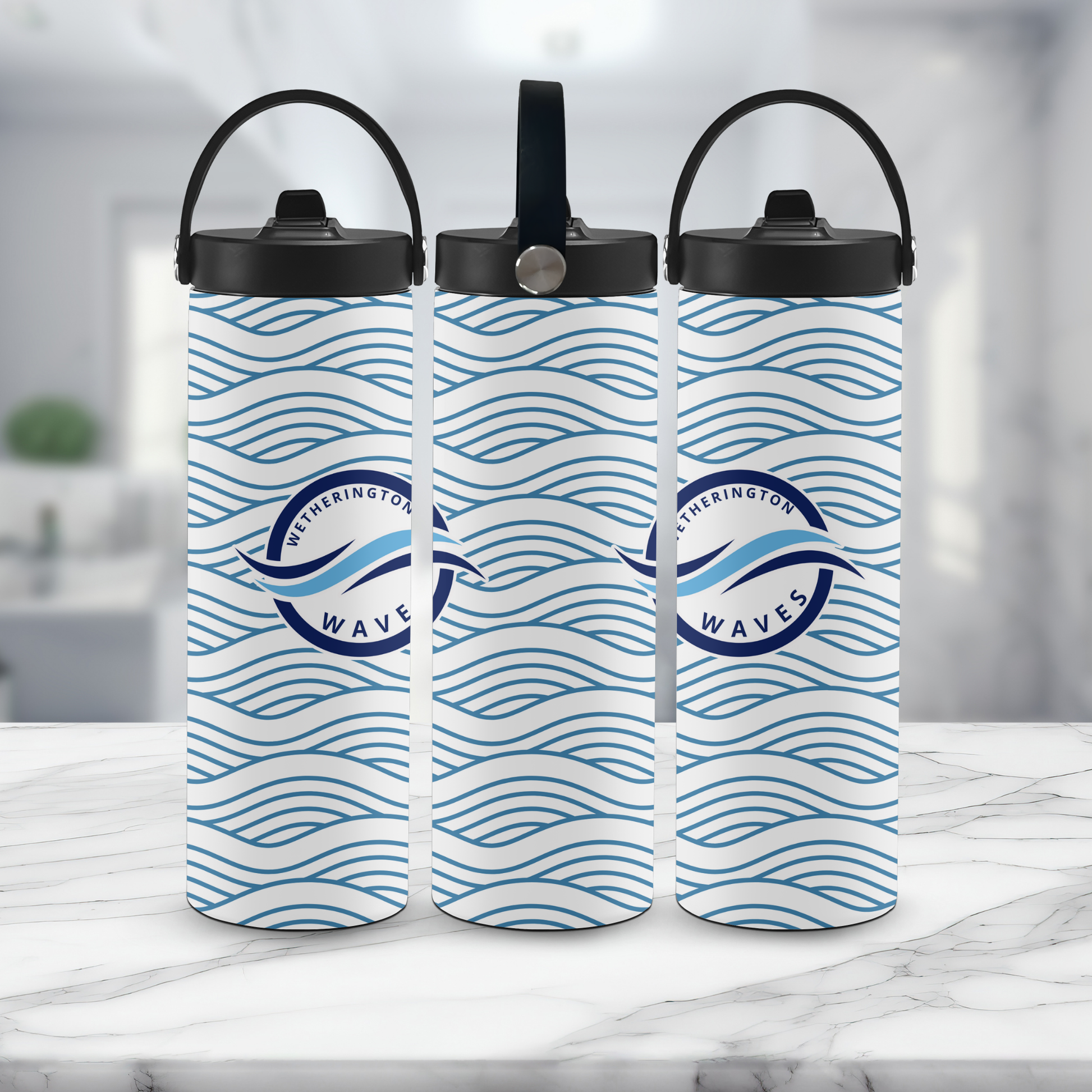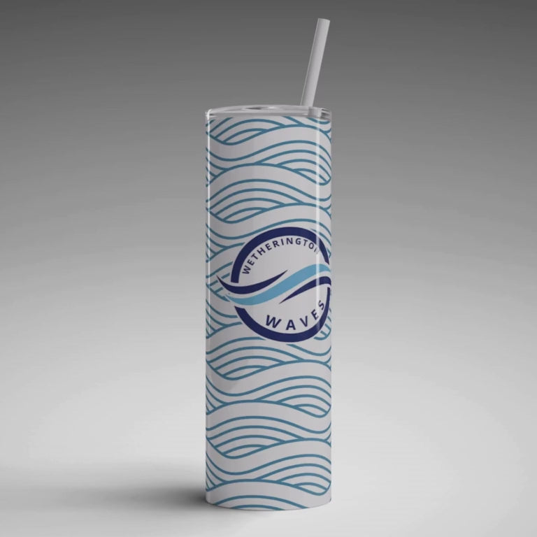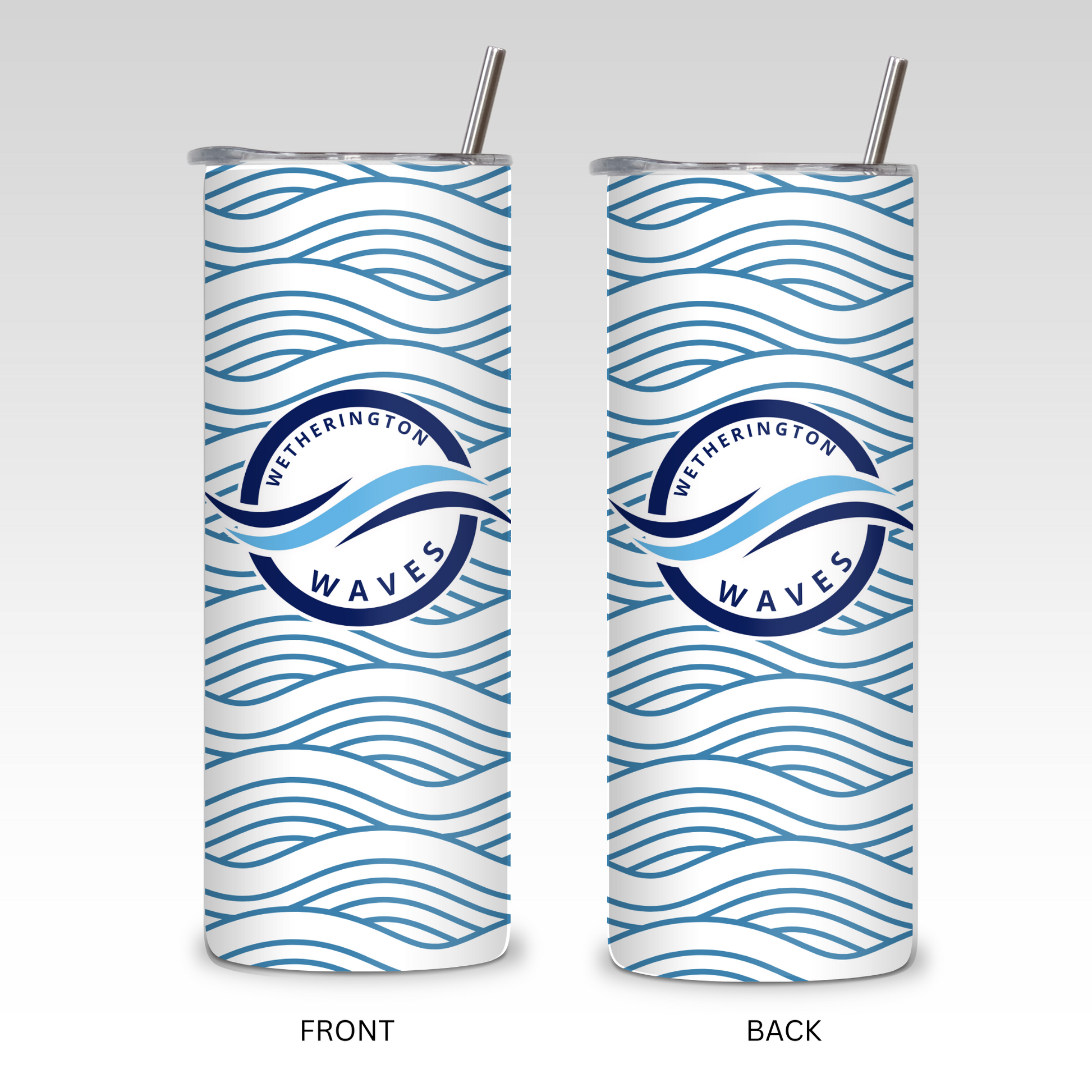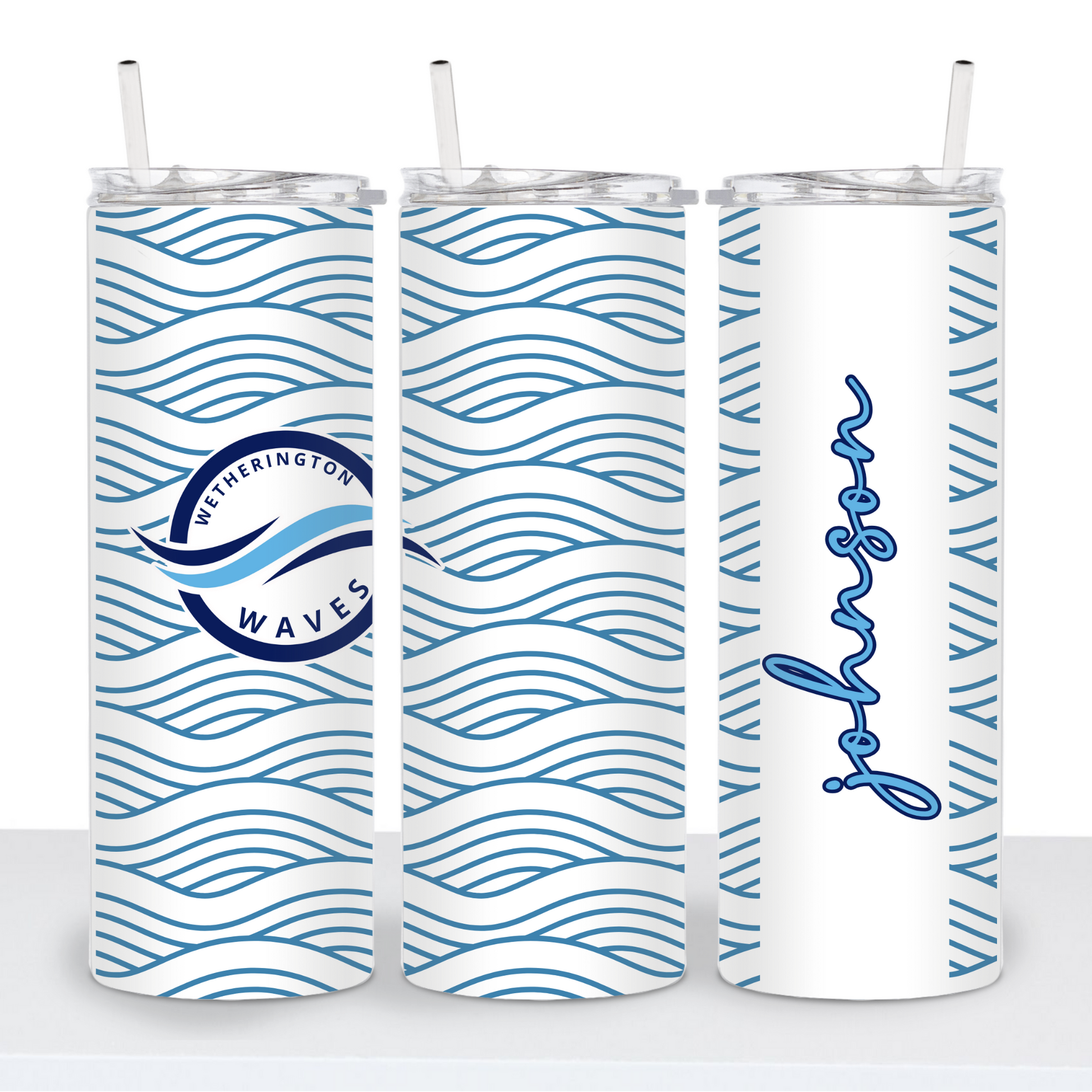 Show off your Wetherington Waves pride with this 20 oz tumbler featuring the classic swim circle logo and a bold nautical wave design. Whether you're poolside, in the stands, or on the go, this double-walled, vacuum-insulated tumbler keeps your drink at just the right temp. It’s perfect for water, sports drinks, or your favorite post-practice refresher. Personalize it with your name to make it uniquely yours—no more mix-ups at meets! This design can be placed on both tumblers and water bottles, making it a stylish and practical choice for swimmers, parents, and fans alike.