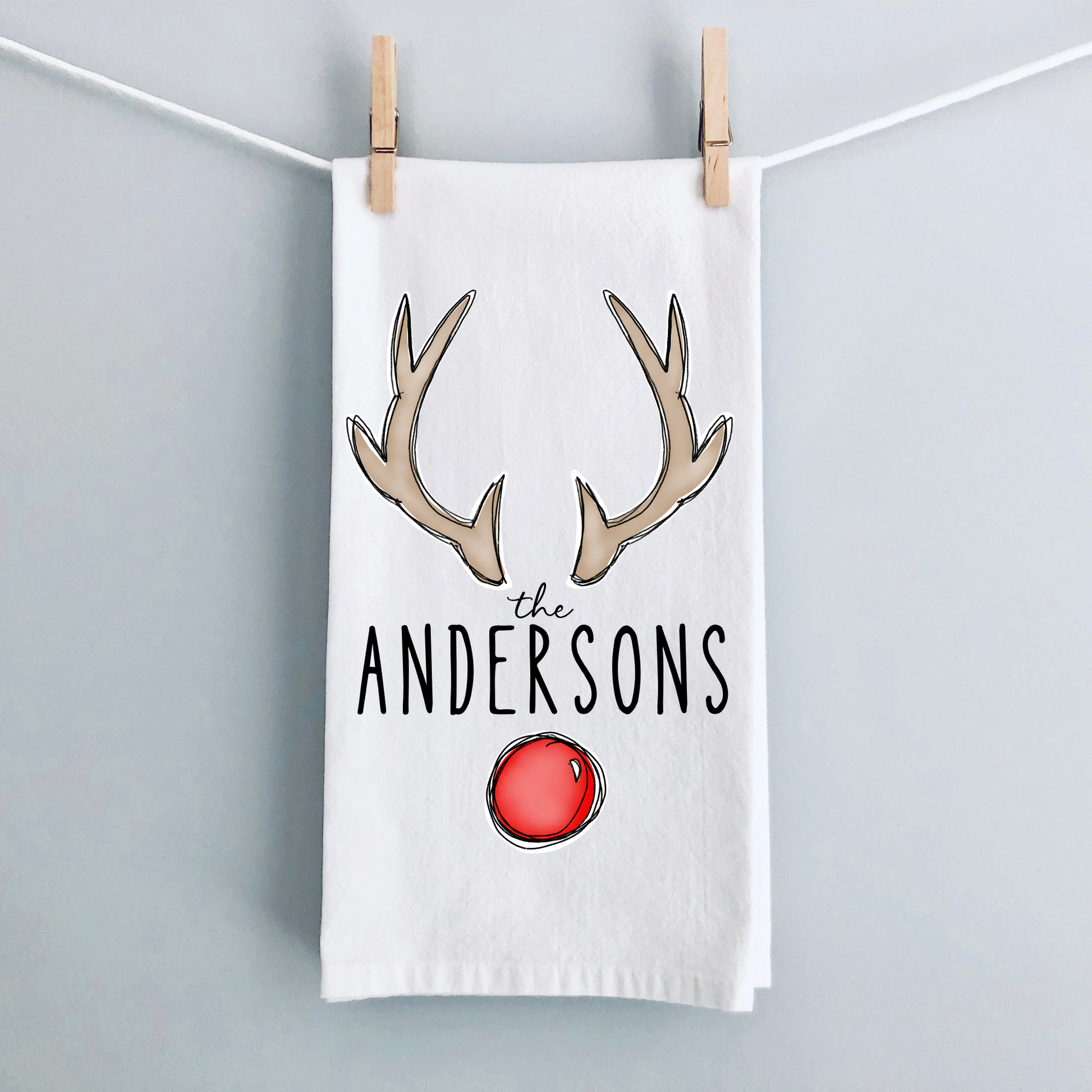 Add a little Rudolph magic to your kitchen this holiday season! This charming towel features a minimalist antler design and a bright red nose — perfectly framing your family name in cheerful holiday style.